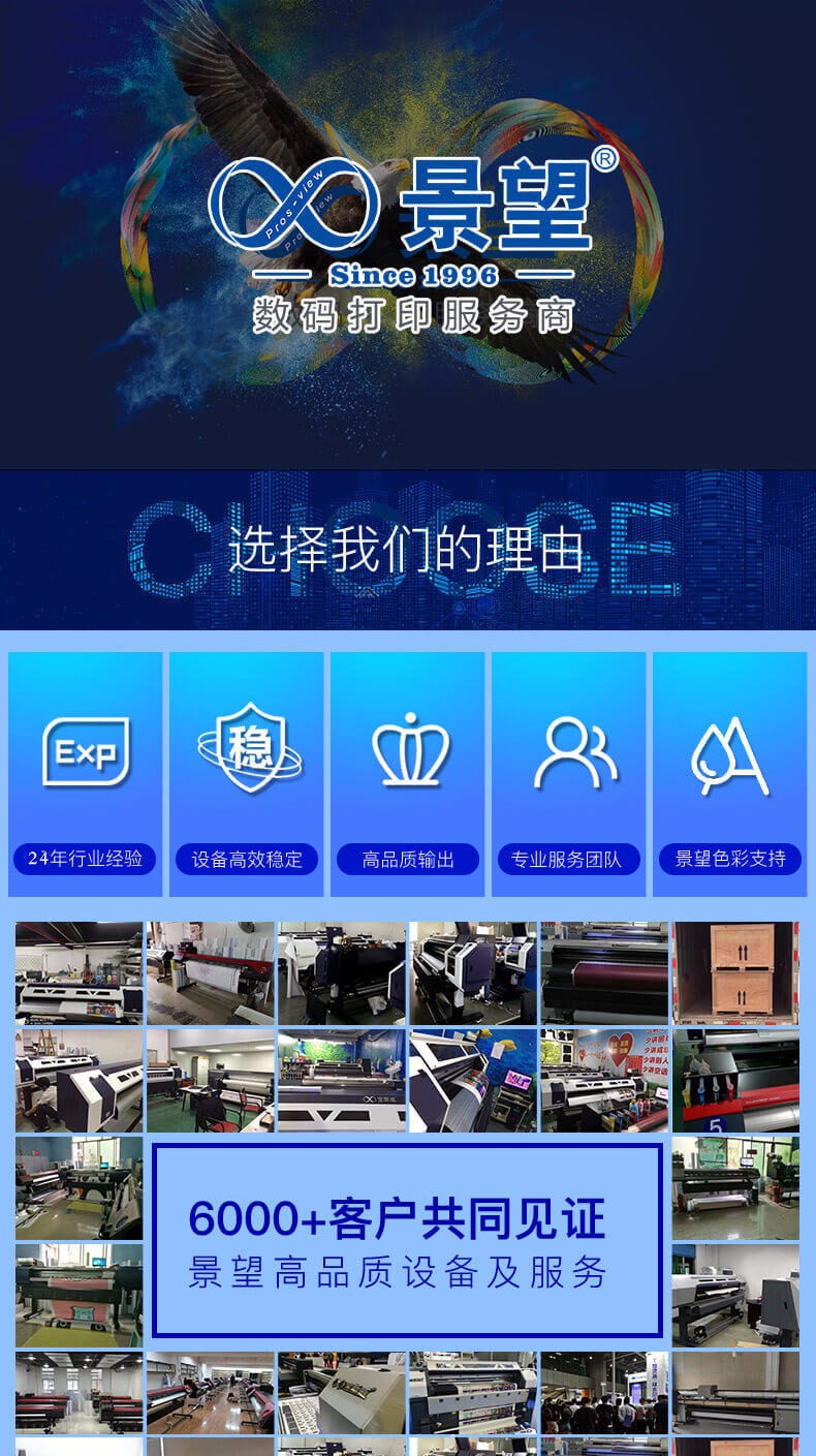 景望诞生于1996年,二十四年来专注数码打印行业,致力于为用户提供优质的数码打印解决方案。目前景望提供的产品及服务,已覆盖国内十多个省份和城市,还通过建立技术支持与服务中心,为超过6000多家的企业用户提供数码打印成像的专业服务。