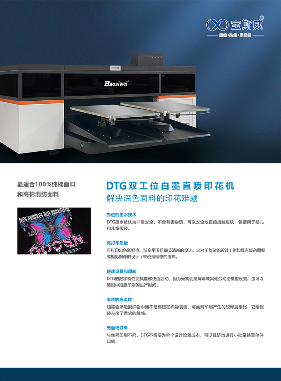 DTG双工位白墨直喷印花机,最适合100%纯棉面料,和高纺面料,解决深色面料的印花难题。